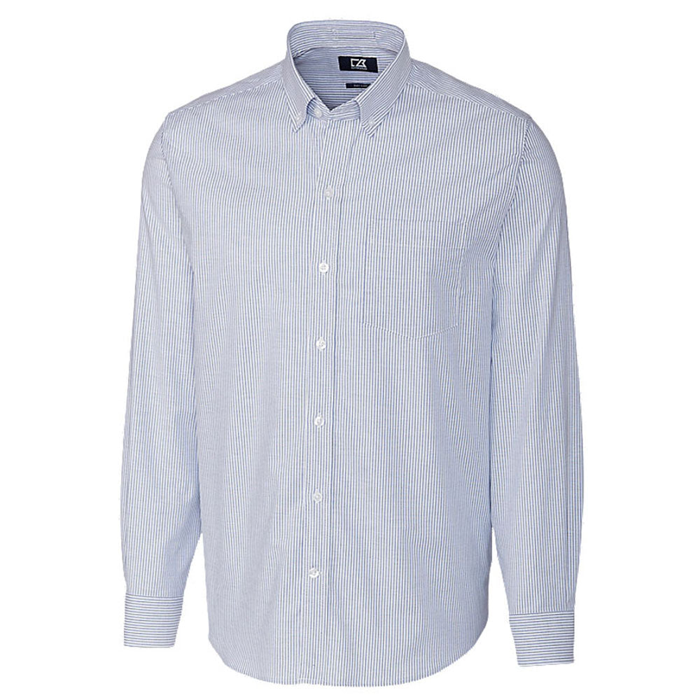 The Cutter & Buck Men's French Blue Tall Long Sleeve Epic Easy Care Stretch Oxford Stripe Shirt is a sharp choice for your company's uniforms. This shirt features a dense series of vertical stripes throughout its entire body with horizontal stripes featured on the back shoulders, the collar, and the sleeve cuffs. The details will complement your custom logo well. The stripes blend perfectly throughout the entire outfit to produce an elaborate yet classy style. The mix of cotton and polyester adds a good texture as well. The button-down collar helps you keep this part of the outfit organized well. The pocket at the front is embedded into the shirt quite well. Order this as a good corporate uniform outfit or as a gift for any long-tenured employee.Highlights