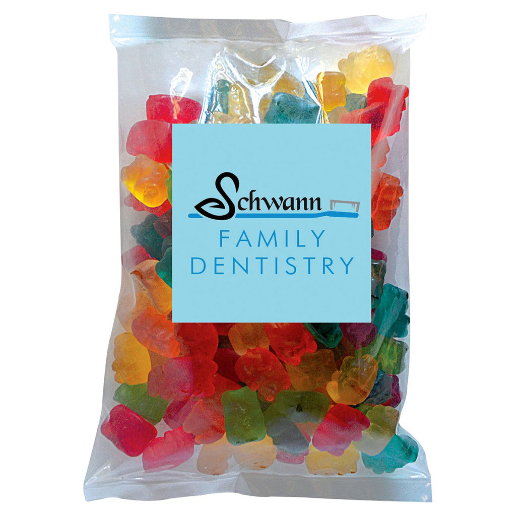 - Filled with Gummy Bears, these promotional gifts include a 4CP label for branding opportunity