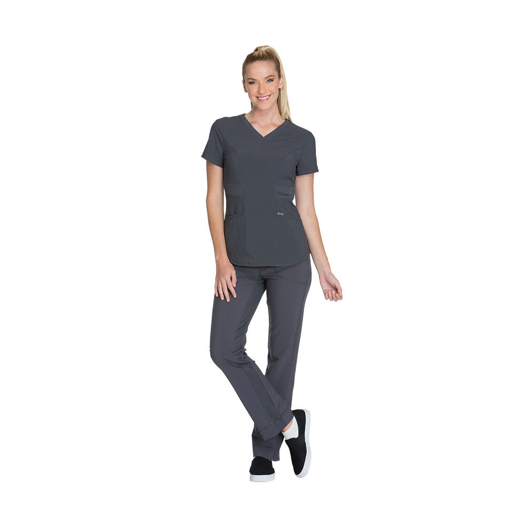 Tackle your workday in Cherokee Women's Pewter Infinity V-Neck Top for Women's featuring a rib waist inset and equipped with stretch rib knit panel for ease of movement and to keep feminine curves comfortable. Princess seams provide streamlining structure. Two patch pockets and an interior pocket are incorporated into this coat to keep your essentials safe and close at hand. Other features include pencil stitch, bungee I.D. badge loop, a shirttail hem, side vents and coverstitch detail. Customize this scrub top to make it uniquely yours with an embroidered logo for healthcare staff in your medical organization.Highlights