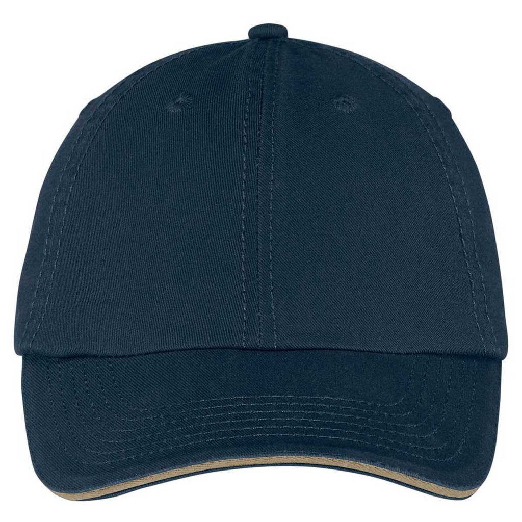 Top off your ensemble with a basic all-season headwear, courtesy of this 6-panel baseball cap constructed with 100% washed cotton twill fabric. The Port & Company Navy/Khaki Washed Twill Sandwich Bill Cap is designed with a self-fabric sweatband and an adjustable hoop and loop closure so that it fits everyone's head. Its visor has a contrast edging also known as a sandwich bill. This budget-friendly cap can be customized with a logo of a company or even a message for use as a corporate giveaway. Use this baseball to create a personalized custom gift for family, friends, or employees for all of those special occasions.Highlights