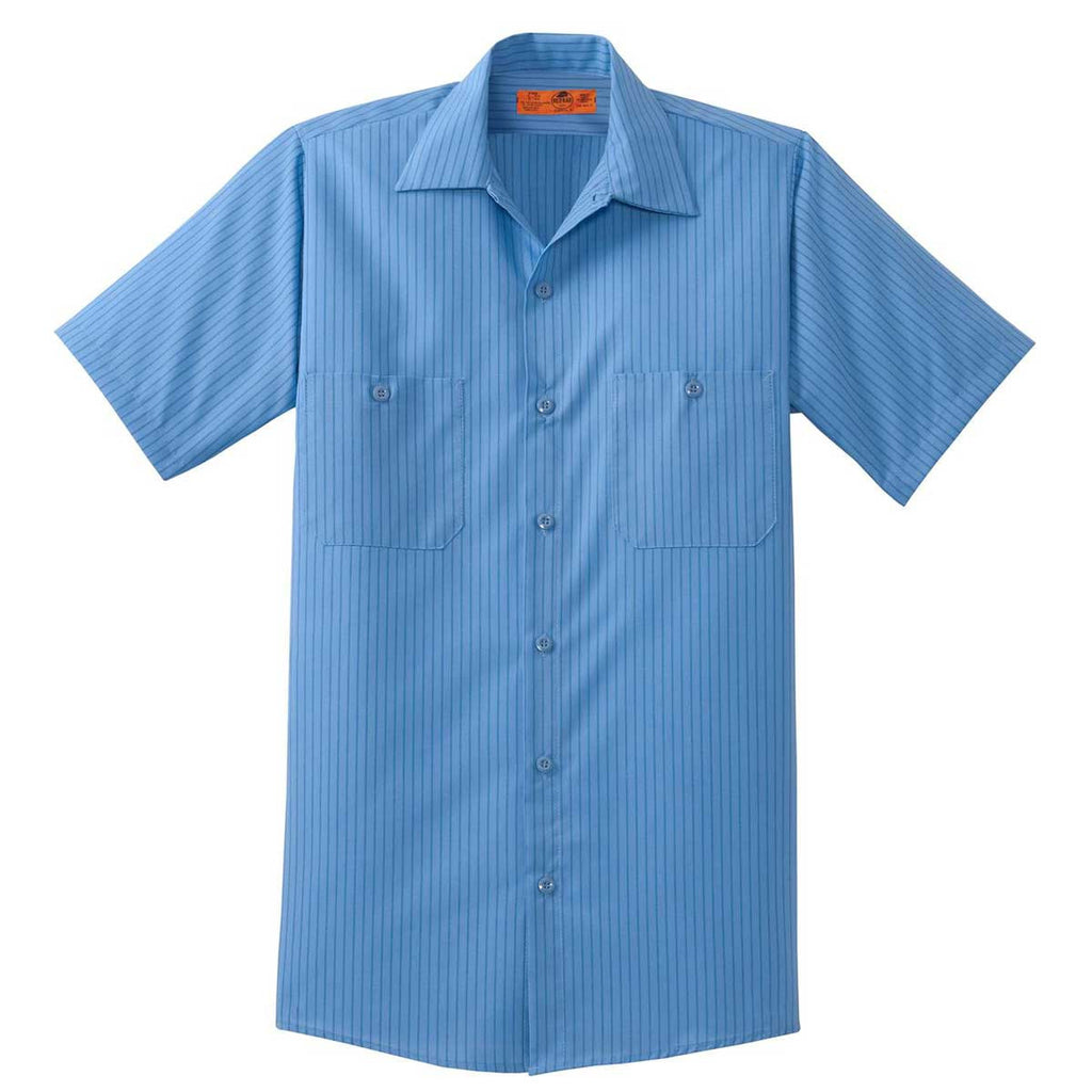 What ever happened to the classic collared work shirt? The answer is simple: absolutely nothing. It's right here. This Red Kap Men's Tall Petrol Blue/Navy Short Sleeve Striped Industrial Work Shirt is a callback to the classic work shirts of a bygone era, all without ever looking outdated in the slightest. Maybe that's due to the modern attention to detailing including lightweight fabric and a bartacked pencil stall. With an open collar, this shirt is every bit professional without ever straying from its blue-collar roots. Add your custom logo to craft a uniform with your unique brand.