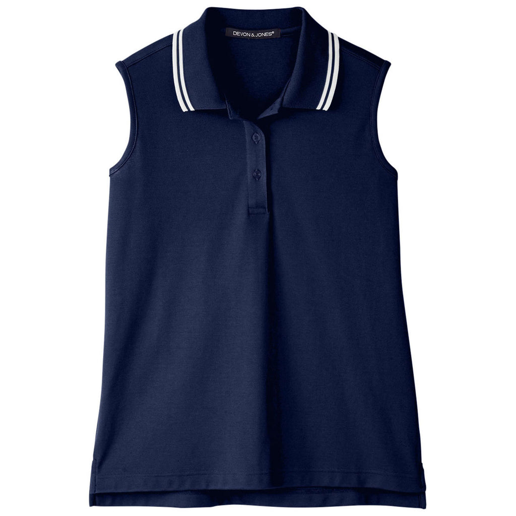 Have a bit of fun with a custom Devon & Jones Women's Navy/White CrownLux Performance Plaited Tipped Sleeveless Polo. This unique dual colored look has a gorgeous look, but in the comfort of a sleeveless top. The polyester cotton blend is perfect for the workplace as employee apparel with a company logo or to give as a custom gift with the embroidery of your choice. Simply wear under a jacket for a look that goes from the office to the club with ease. The active fit paired with easy care allows for freedom of movement throughout your day. The hi-low hemline adds a bit of coverage to this choice apparel.Highlights