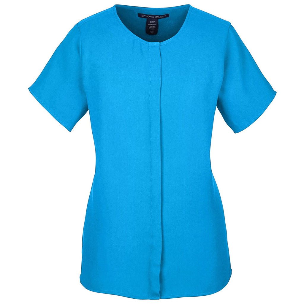 Add embroidery to the Devon & Jones Wome Ocean Blue Perfect Fit Short-Sleeve Crepe Blouse for corporate apparel that is fun to wear. This simple, 100% polyester crepe blouse is stylish, yet simple so it can be easily layered or worn alone as needed. In button up style, the buttons are incorporated in a hidden center front placket. Created with the flattering "perfect fit" with side slits, you can add a company logo to use for an employee event in which your workers need to be recognizable or a custom logo to add to your logoed apparel line.Highlights