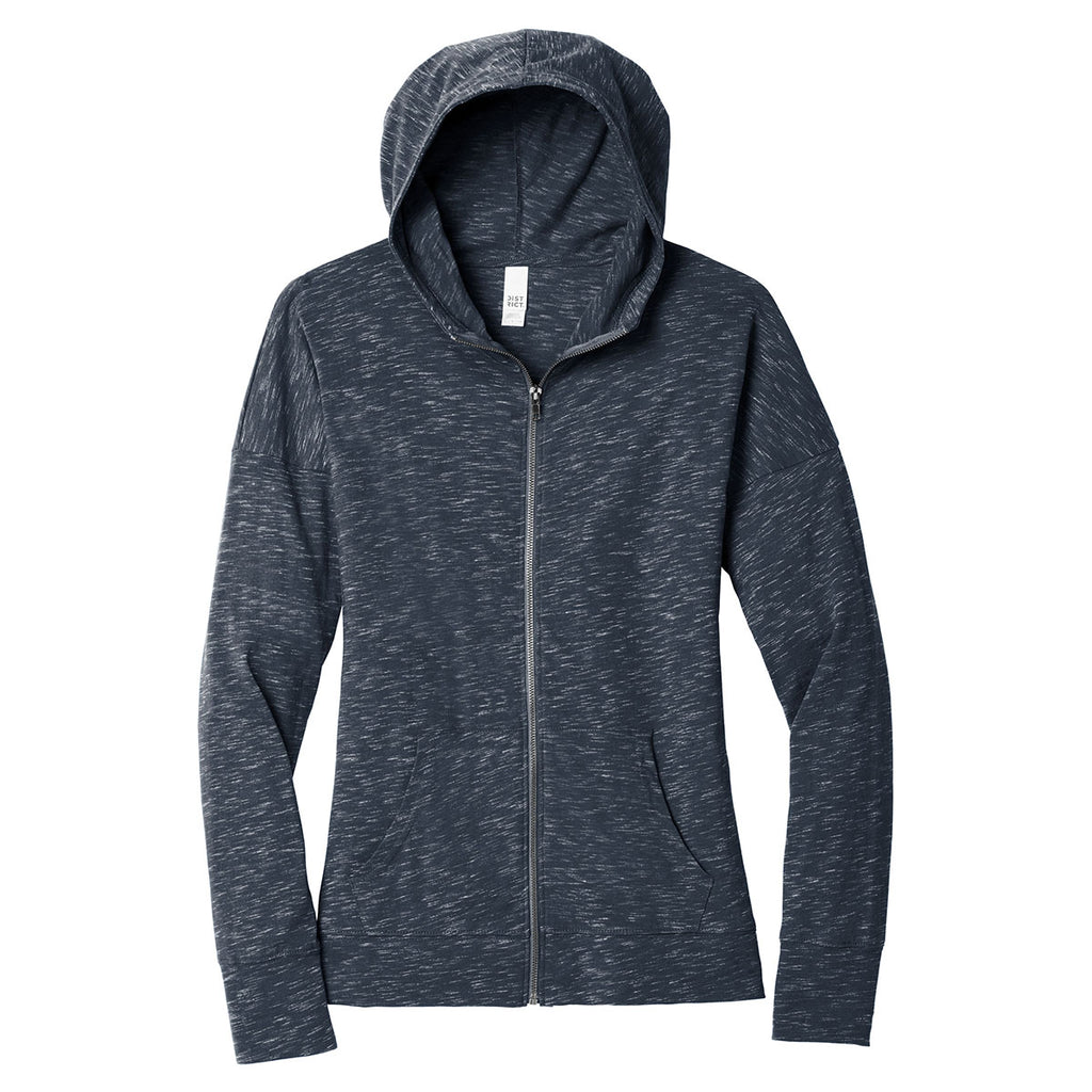 For corporate apparel that will make your team proud, give away the decorated District Women's New Navy Medal Full-Zip Hoodie. Designed with a front pouch pocket for storing electronic devices and business accessories, the full-zip, lightweight hoodie contains 90% ring spun cotton that delivers supreme comfort. The fabric is finished with polyester fibers that bolster the strength of the versatile outerwear. Self-fabric hem and cuffs create an attractive appearance that will get the attention of the people you meet at civic events. Add a custom logo on the embroidered area to gain more loyal customers.Corresponding Men's Style:District Men's New Navy Medal Full-Zip Hoodie
