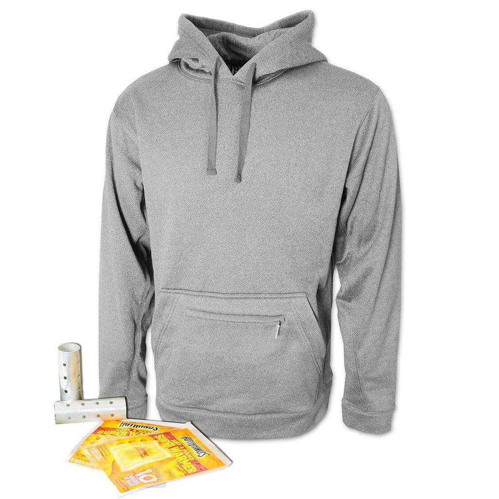 If you know a man who works outside or goes hunting or fishing, he will give you his next catch for the BAW Men's Heather Grey Elements Mossy Oak Heavy Duty Fleece. And if you have placed your custom logo on the front, all his buddies will see it and envy him. Yes, it is fully cover-seamed and has dyed-to-match draw cord. But there are also several surprises. It has a front pouch pocket to keep hands warm - and it also has built in heat warmer canisters! Where else will be get one of these? They come in S to 4X. You have your choice of colors and patterns.Highlights