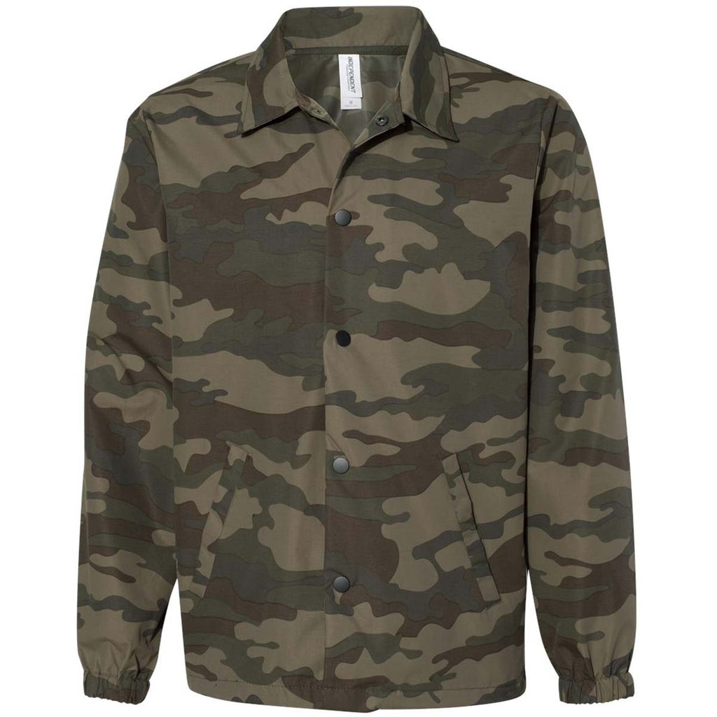 Take the lead in a custom embroidered Independent Trading Co. Men's Forest Camo Water Resistant Windbreaker Coaches Jacket . Available in a range of classic colors the 100% nylon 33D waterproof coating has an inner PU coating with a breathability of 5,000. With no ling, this lightweight jacket can be customized with your company logo to use as part of employee apparel or uniform or given as employee gifts at a special occasion. The elastic cuffs, underarm grommets, and drawstring closure add to the overall look. Place an order for a few or an entire box while supplies last.Highlights