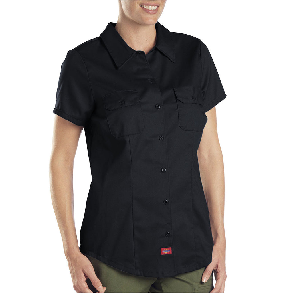 Dickies is certainly a top name in working apparel and your custom logo will seem right at home embroidered on this Dickies Women's Black 5.25 Oz. Twill Shirt. There are so many features that are indicative of the Dickies quality. Washing and wearing is made easier with the addition of the Visa moisture-wicking and stain-release finish. The fit is outstanding thanks to front darts. This shirt also features a banded collar with top stitching, two chest pockets, 20-line melamine buttons and the classic Dickies logo patch at the bottom of the placket. Sizes are S to XL in your choice of black, dark navy, graphite and khaki.