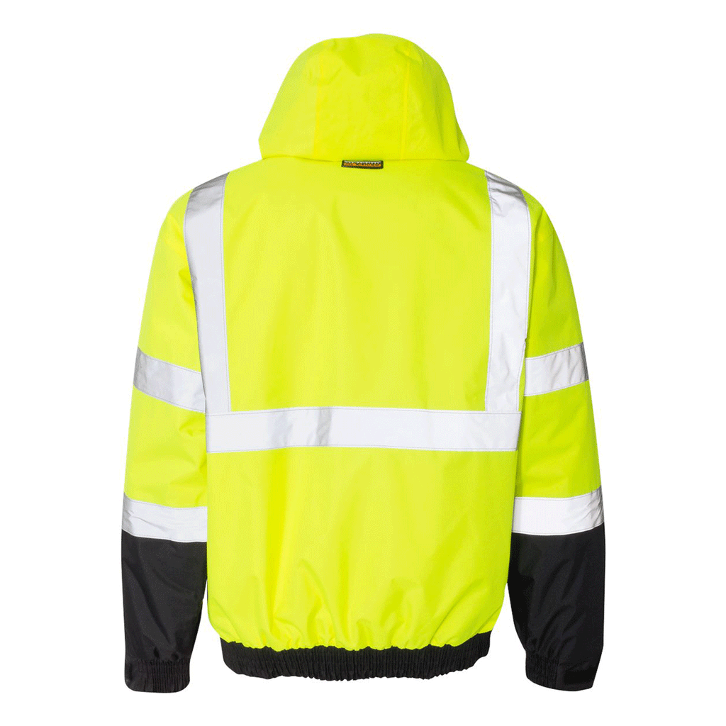 Add an embroidered company logo to the ML Kishigo Men's Lime Economy Bomber Jacket to give an employee gift that can double as workwear. The 300D durable waterproof seam sealed shell with thermal insulation is lightweight, but will keep you warm when its cool outside. The reflective material will get you noticed and keep you safe whether hunting or working outdoors. Add a custom logo to create an industrial apparel line that can be worn by anyone. The small extras like a hidden collar hood, larger radio pocket on the chest, multi-use vertical pocket and outside slash pockets make this great for officers and firemen as well as industrial workers.Highlights