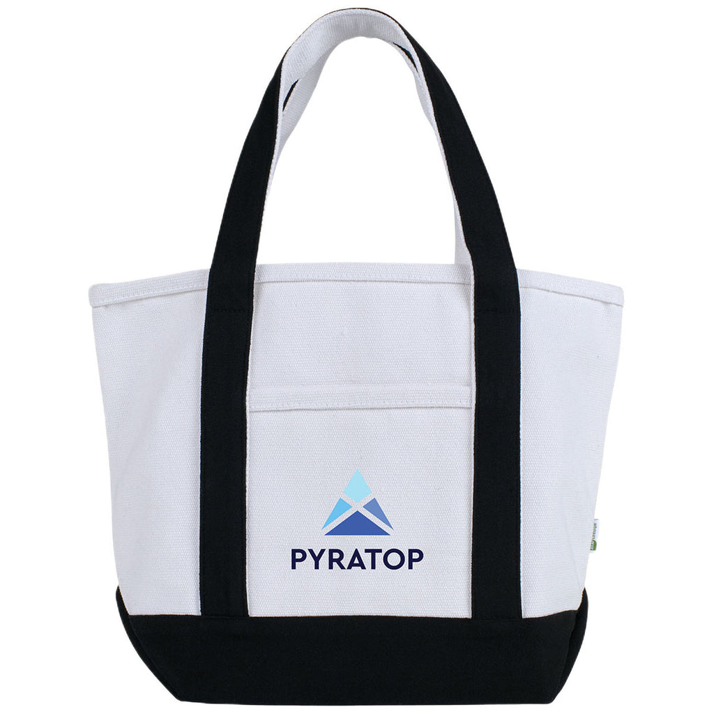 The Logomark Black Roan Mini 24 oz. Recycled Canvas Tote is a custom favorite for boutiques, welcome kits, or eco-friendly events. Made from recycled cotton, it's compact, durable, and reusable. Ideal for carrying essentials, packaging gifts, or adding a sustainable twist to your logoed merchandise.The minimum order for this product is 50 pieces.