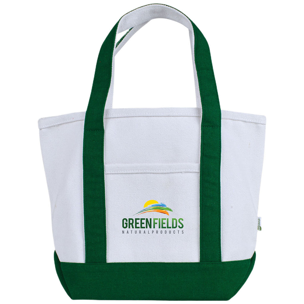 The Logomark Green Roan Mini 24 oz. Recycled Canvas Tote is a custom favorite for boutiques, welcome kits, or eco-friendly events. Made from recycled cotton, it's compact, durable, and reusable. Ideal for carrying essentials, packaging gifts, or adding a sustainable twist to your logoed merchandise.The minimum order for this product is 50 pieces.