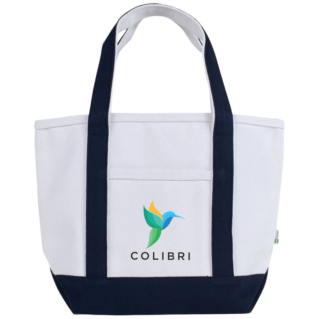 The Logomark Navy Roan Mini 24 oz. Recycled Canvas Tote is a custom favorite for boutiques, welcome kits, or eco-friendly events. Made from recycled cotton, it's compact, durable, and reusable. Ideal for carrying essentials, packaging gifts, or adding a sustainable twist to your logoed merchandise.The minimum order for this product is 50 pieces.