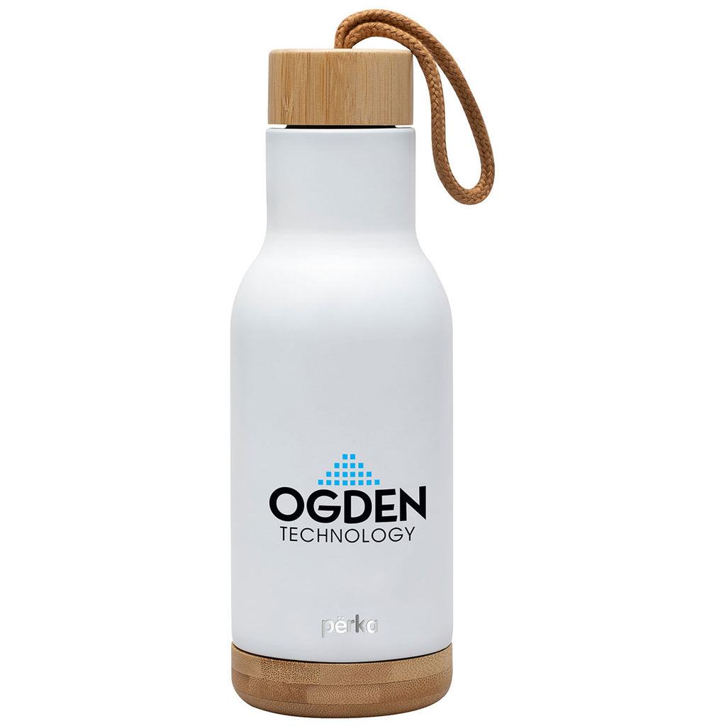 There's something cool and contemporary about the Perka Altair 17 oz. Double Wall, Stainless Steel Water Bottle. Made with bamboo at the base and lid, it will highlight your company's custom logo or design like no other item can. The braided cotton carry handle makes it even easier to grab.The minimum order for this product is 48 pieces.