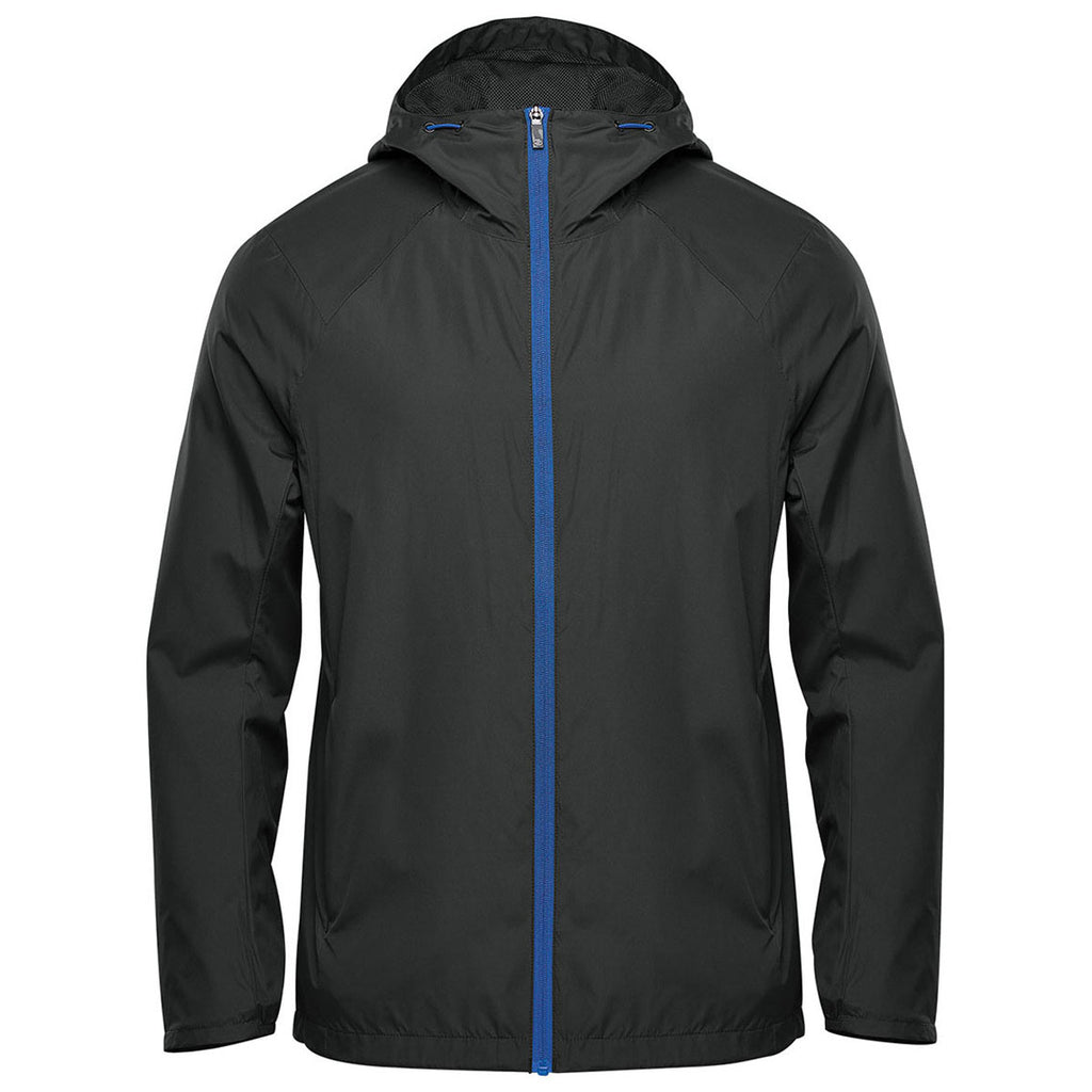 Choose custom embroidery for the Stormtech Men's Black/Classic Blue Pacifica Jacket to create the ultimate custom gift for everyone on your list. The urban inspired, outdoor ready jacket is lightweight and sleek with back mesh ventilation and articulated elbows for ease of movement. Perfect for those pop up showers, the attached hood keeps you protected and zippered hand pockets keep small items secure. Add a company logo to use as extra pieces of uniforms for those who work outdoors or a custom design to add these to your logoed apparel line. Place your order today.Highlights