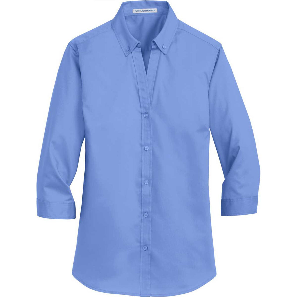 With a button-down collar and open Y neckline, the Port Authority Women's Ultramarine Blue 3/4-Sleeve SuperPro Twill Shirt sets the fashion standard for corporate apparel. The versatile Women's 3/4-sleeve shirt contains a cotton-polyester blend that keeps you looking sharp throughout a busy day. Wear the twill shirt to the office and then keep it on for a social engagement in the evening. The back yoke and side pleats present a stylish appearance that turns heads. Single button notched sleeve cuffs provide you the option to roll up your sleeves. Add a custom logo to the shirt for promoting your company in the field.Highlights