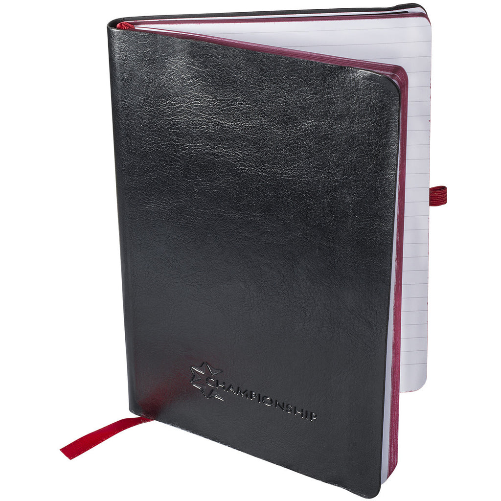 The minimum order for this product is 25 piecesThe Deboss imprint method used for the Leeman Black/Red Venezia Journal helps elevate your marketing game. Measuring 2.5" wide by 1.5" tall, the large imprint area is centered on the bottom of the front cover. By attaching your corporate logo, you create a cost effective marketing tool that increases awareness of your company throughout the community. Ninety-six ruled pages provide plenty of writing space to prepare a lengthy business presentation. The elastic loop closure ensures the notes remain protected against beverage spills. Matching-colored edges complement the elegance presented by the super soft faux leather cover.