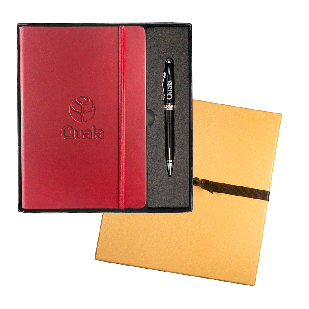 The Leeman Red Tuscany Journal & Executive Pen Set combines two of Leeman's most popular corporate gifts. Rugged aluminum keeps the pen writing flawlessly. The real treat is the quick twist-action that has you writing on one of the journal's 80 ruled pages in no time. Change the pen into stylus for writing on iPads and tablets. The elastic loop closure protects your business meeting notes from beverage spills, as well as strong impacts caused by accidental drops. Add your company logo to the two-in-one corporate gift to make customer prospects know your brand stands for quality.