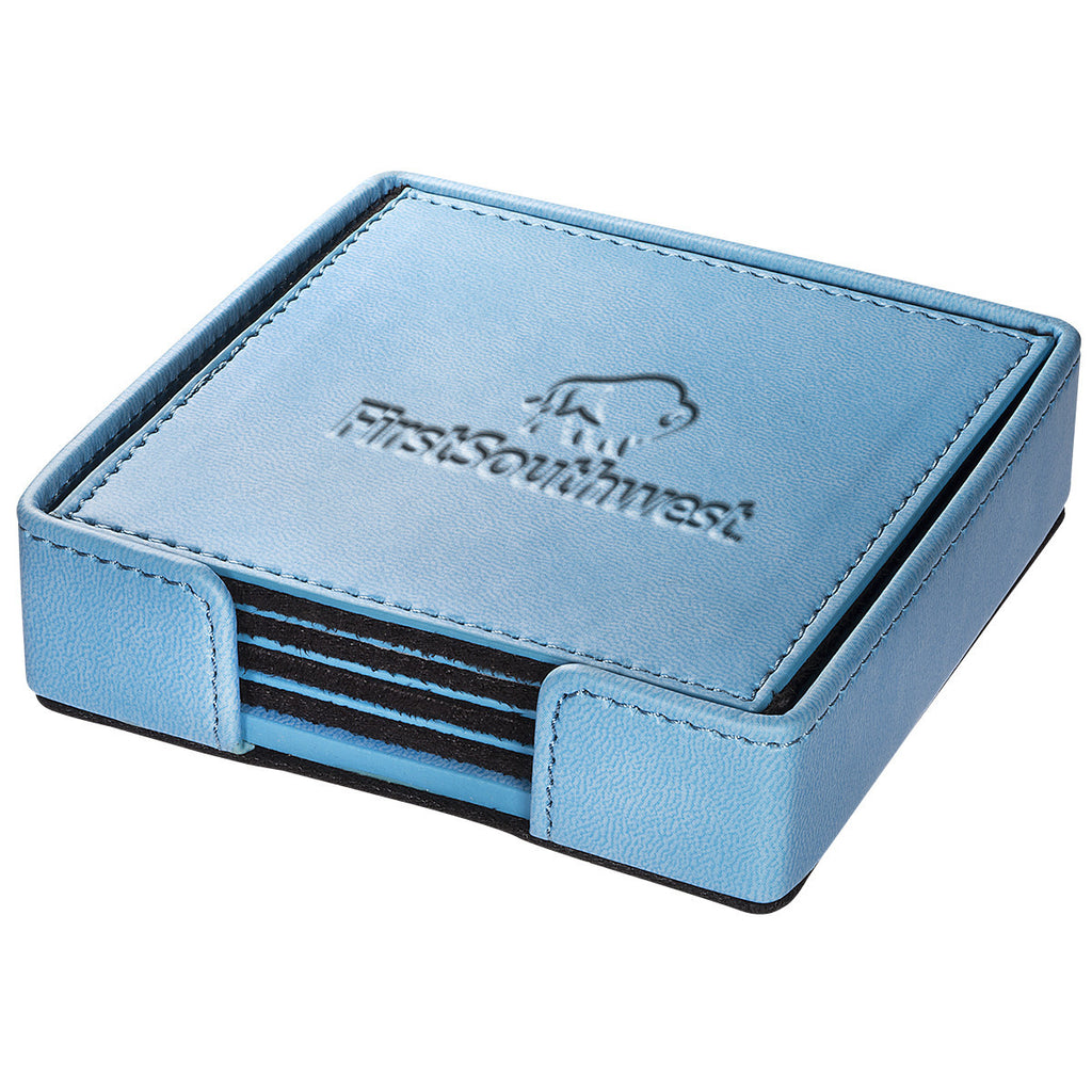 The minimum order for this product is 25 piecesEveryone invited to the party has arrived and it is time to serve the drinks. Once you set the coasters down for the drinks, you notice your guests admiring the design of the Leeman Light Blue Tuscany Coaster Set. Each set contains four square coasters that measure about 3.75" wide, which is more than enough room to set down most sized beverage glasses. Available in five colors, you can mix and match the coasters to the mood of different parties. The faux suede bottom offers a stable platform to steady full drink glasses. Add a custom logo to the coasters and watch awareness of your company soar.