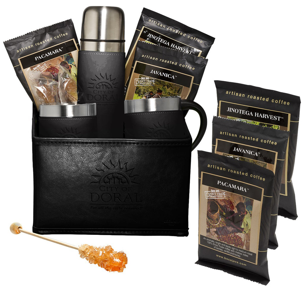 Edible enticements go a long way toward creating bonds with recipients. Pair them with coordinating non-food promo items and you're business is sure to leave a lasting impression. Case in point: Leeman Black Tuscany Thermos and Cups Coffee Set. This delicious and unique gift set includes Tuscany Thermal Bottle, two Tuscany Coffee Cups, the Folding Bin and three packs of Boca Java Artisanal coffee, 2 sugar sticks. 16.9 oz. stainless steel thermal bottle and 10 oz. double-wall stainless steel cups are all finished with soft faux leather sleeves. All items come in a glazed faux leather collapsible bin.