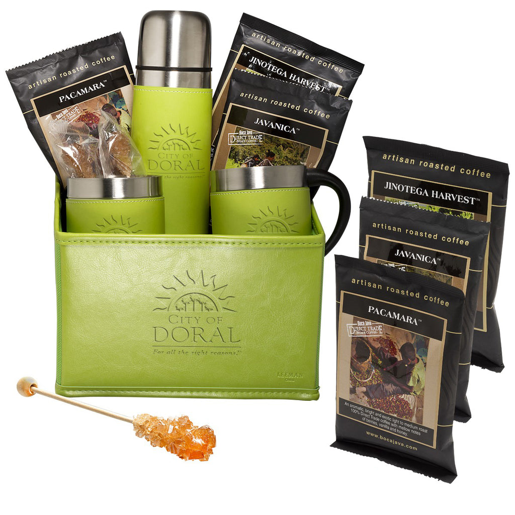 Edible enticements go a long way toward creating bonds with recipients. Pair them with coordinating non-food promo items and you're business is sure to leave a lasting impression. Case in point: Leeman Lime-Green Tuscany Thermos and Cups Coffee Set. This delicious and unique gift set includes Tuscany Thermal Bottle, two Tuscany Coffee Cups, the Folding Bin and three packs of Boca Java Artisanal coffee, 2 sugar sticks. 16.9 oz. stainless steel thermal bottle and 10 oz. double-wall stainless steel cups are all finished with soft faux leather sleeves. All items come in a glazed faux leather collapsible bin.The minimum order for this product is 6 pieces.