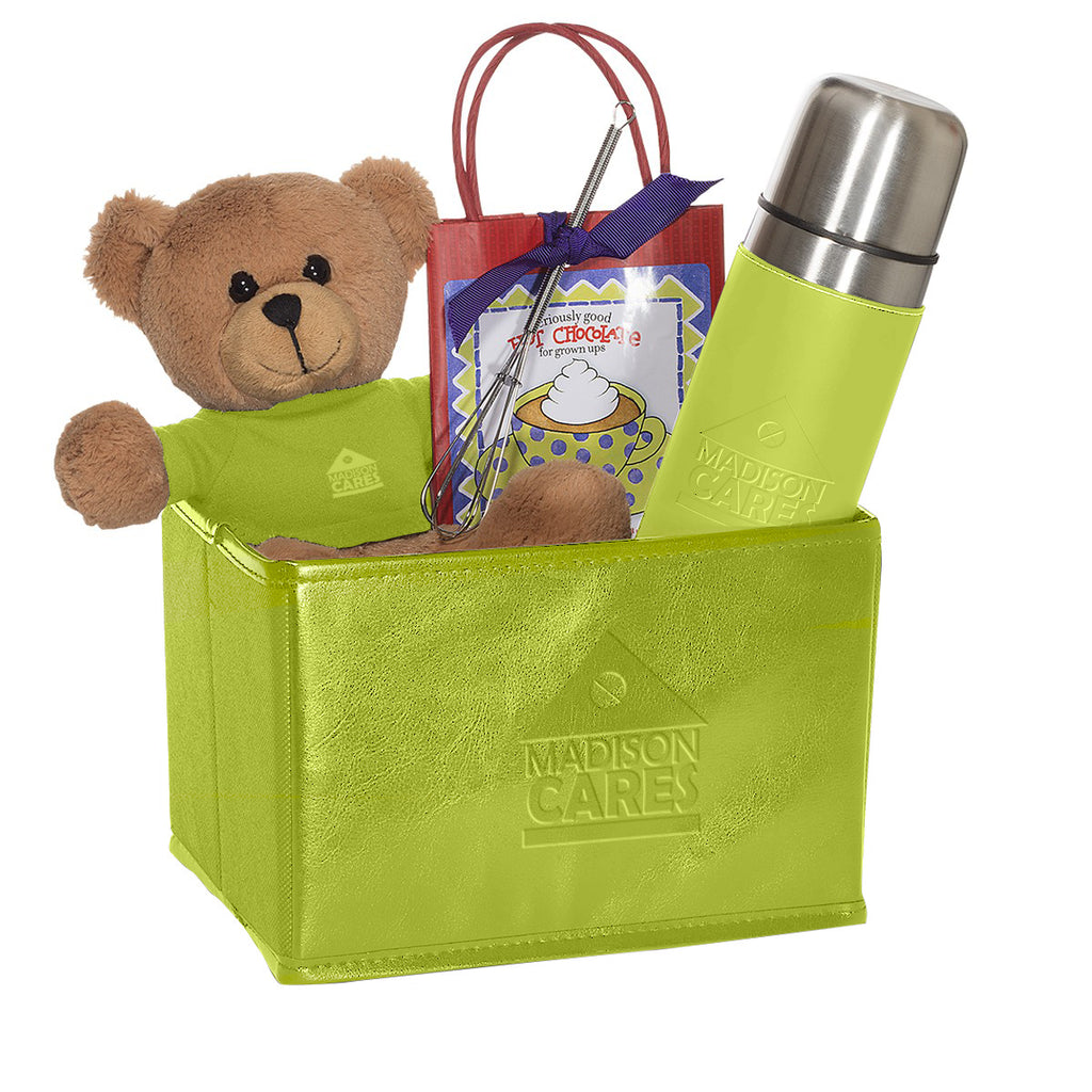 The holiday season is around the corner! Leeman Lime-Green Tuscany Thermos, Bear and Hot Cocoa Set is perfect for gift giving and improving your brand's awareness. It offers a creative and memorable way for you to thank your customers, recognize employees and helps you achieve new business. The friendly stuffed bear will always wear your logo well! Its t-shirt "bearing" your promotional logo will brighten up anyone's day. Thermos 16.9 oz. made of stainless steel with bonded leather sleeve for your custom logo imprint. The festive package also contains a personalized bag of cocoa mix making a perfect gourmet addition to a holiday gift set. All goodies come in a Venezia Folding Bin.