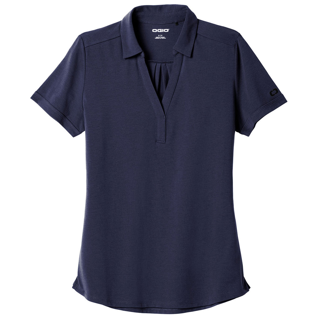 Make a lasting impression on customers by ordering the custom logoed OGIO Women's Navy Limit Polo for the members of your corporate team. As one of the most stylish short sleeve shirts for employee uniforms, the cotton and polyester blended polo withstands the rigors of frequent use to deliver years of fashionable performance. Stylish open Y-neck placket exudes class, while the set-on, cuffed sleeves allow for optimal arm movement flexibility. Moisture wicking technology ensures maximum comfort throughout every workday. Attach your company logo on the large screen embroidered area to power your brand to the top of the competition.