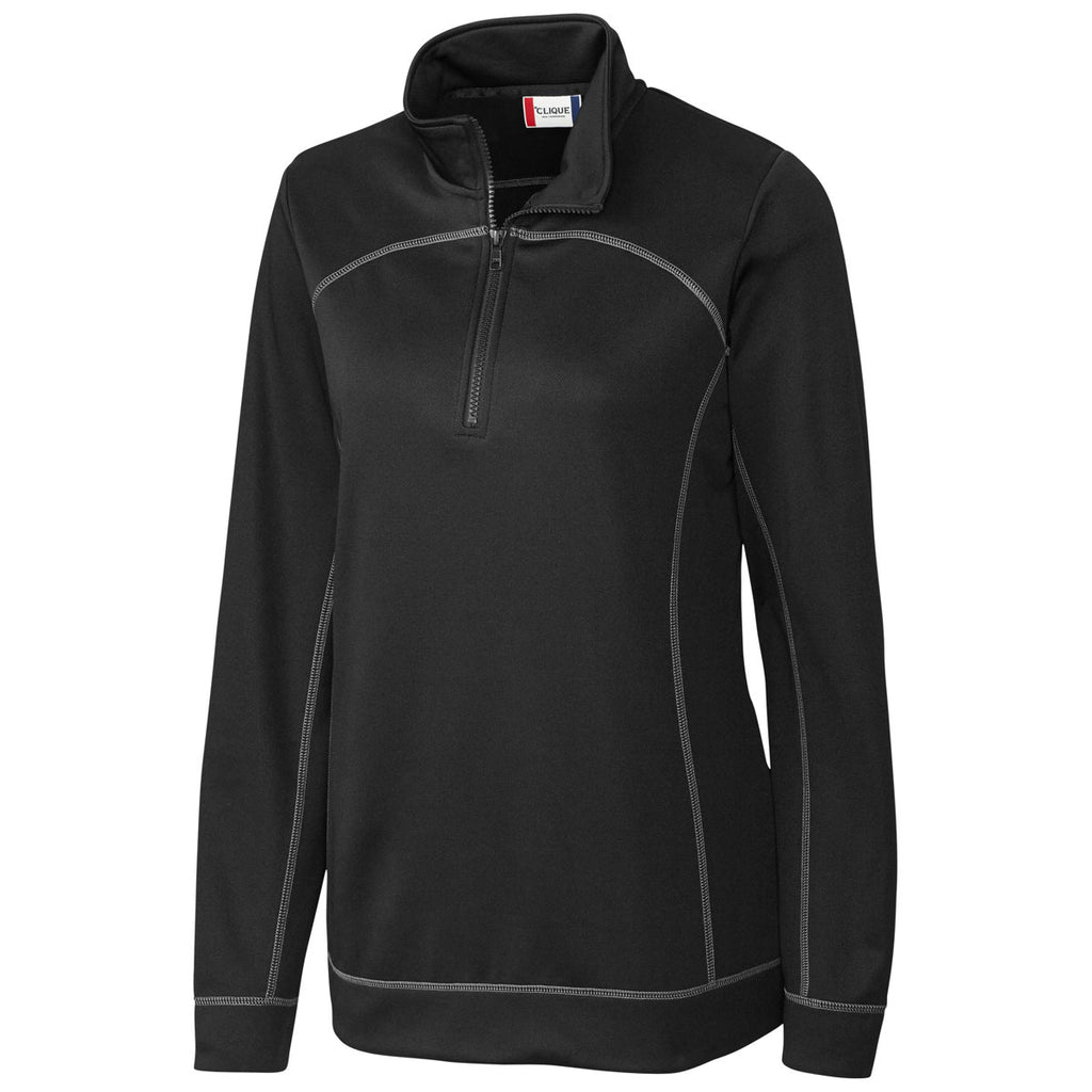 With super soft fleece on the inside, the logoed Clique Women's Black Helsa Half Zip does a great job of trapping body heat to keep you feeling warm all day long during weekend camping trips. The shiny polyester fabric remains in mint condition even after going through years of high performance use. Moisture wicking technology makes the half zip jacket perfect for layering over a Clique tee or as the middle layer of a cold weather fashion ensemble. Add a custom logo on the large embroidery area to shine the marketing spotlight on your products and services.Corresponding Men's Style:Clique Men's Black Helsa Half Zip