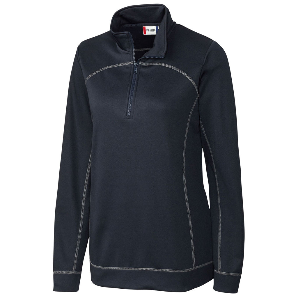 With super soft fleece on the inside, the logoed Clique Women's Dark Navy Helsa Half Zip does a great job of trapping body heat to keep you feeling warm all day long during weekend camping trips. The shiny polyester fabric remains in mint condition even after going through years of high performance use. Moisture wicking technology makes the half zip jacket perfect for layering over a Clique tee or as the middle layer of a cold weather fashion ensemble. Add a custom logo on the large embroidery area to shine the marketing spotlight on your products and services.Corresponding Men's Style:Clique Men's Dark Navy Helsa Half Zip