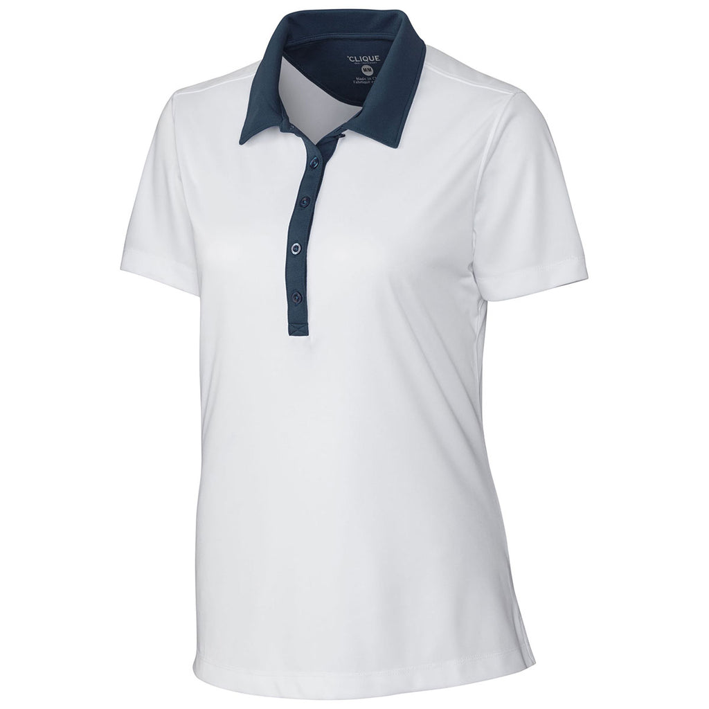 The Clique Women's White/Navy Parma Colorblock Polo offers a stylish design and comfortable fit. When you add your embroidery custom logo to the front, you have a corporate apparel item that you can hand out as employee apparel or distribute at upcoming trade shows and golf events. Available in a variety of eye-catching color schemes, this women's polo shirt also includes wonderful features such as a light 100% polyester fabric, self-collar with four-button placket, and coverstitch detailing. This modern style shirt is sure to be a fan favorite, so be certain to buy this item in bulk!Corresponding Men's Style:Clique Men's White/Navy Parma Colorblock Polo