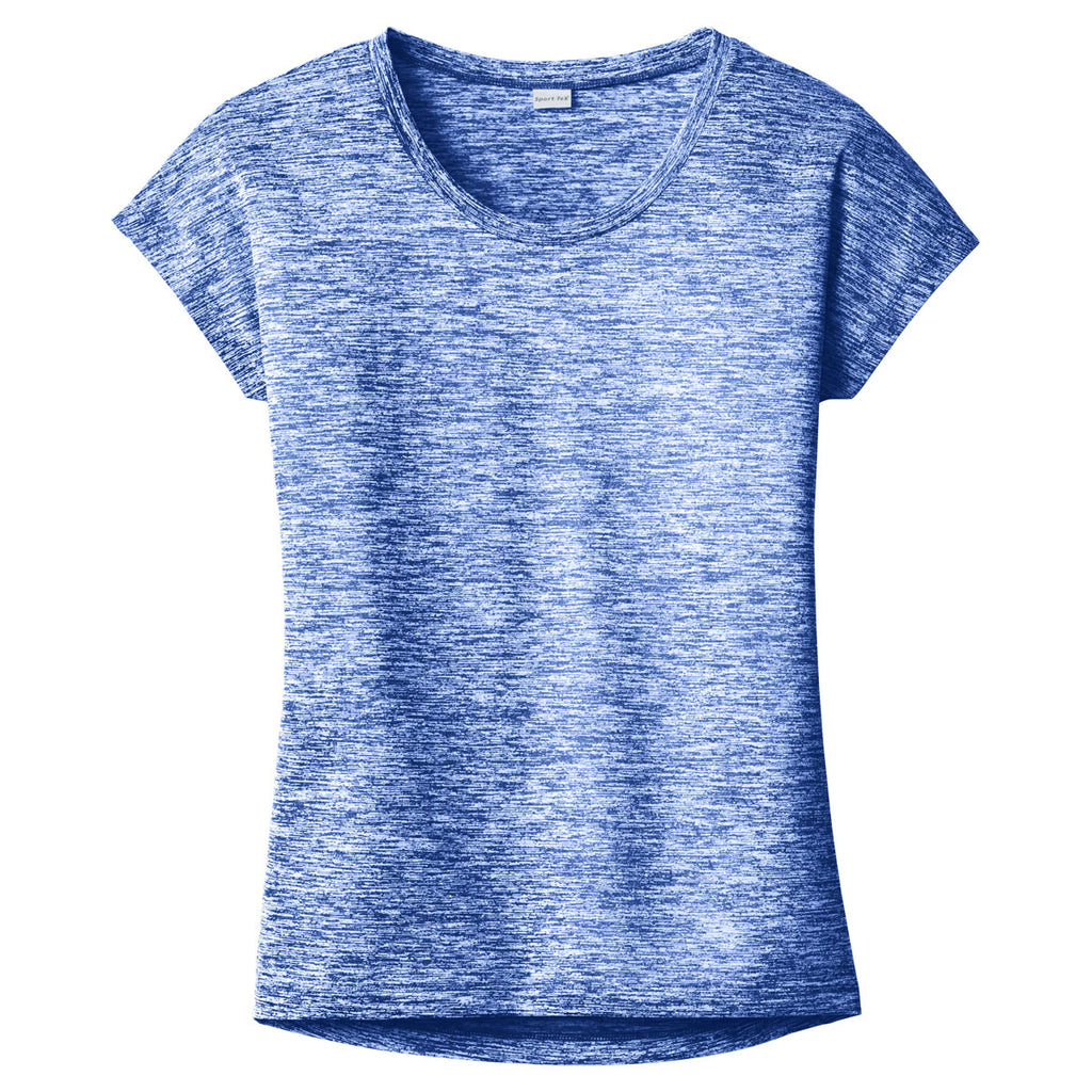 Do moisture laden t-shirts bog you down whenever you need to ramp up the competitive juices? Sport-Tek Women's True Royal Electric PosiCharge Electric Heather Sporty Tee contain moisture wicking technology that quickly evaporates perspiration the instant it forms on your skin. The result is a cooling of the skin that invigorates your body. Set-in sleeves allow for more arm movement, which comes in handy on the golf course and tennis court. The super soft fabric endures countless wash and dry cycles, without any of the colors fading. One-hundred percent rugged polyester interlock resists rips and tears. Attach your company logo to the t-shirts to spread the word about your brand.Corresponding Men's Style: Sport-Tek Men's True Royal Electric PosiCharge Electric Heather Tee