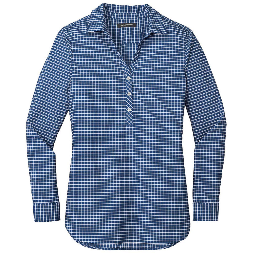 Look great while staying busy with a custom Port Authority Women's True Blue/White City Stretch Tunic. This gorgeous tunic comes in several solid and patterned options and sizes with a classic corporate style. Made of a poly and spandex blend this tunic can be embroidered with the company logo or design of your choice. Perfect for those long days at work with odor-fighting, moisture wicking, and wrinkle resistant technology. The longer length means you can keep the professional look with an open collar and neckline, pearlized buttons, curved hem, and rounded adjustable cuffs.Corresponding Men's Style: Port Authority Men's True Blue/White City Stretch Shirt