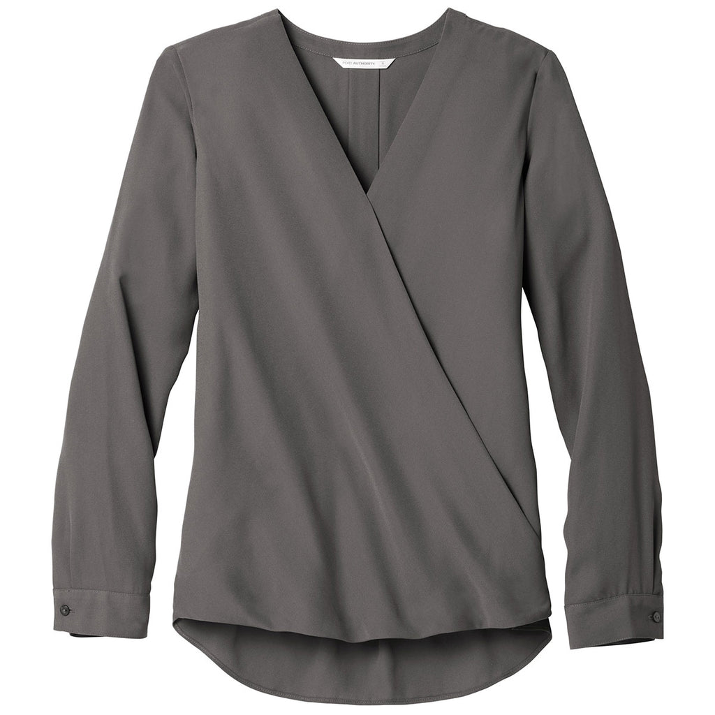 With a dazzling silhouette, the company logoed Port Authority Women's Sterling Grey Wrap Blouse will impress the female job candidates that attend the next corporate recruiting event. The soft drape complements the design of the rounded back hem to create a professional appearance, as well as attractive clothing that you can wear anywhere. Lightweight polyester crepe does not bog you down at social events, while withstanding the punishment handed out by your active lifestyle. Black pleat detail produces a polished look that is ideal for attending civic events. Wear the blouse at the office and keep it on after the workday when you mingle with friends at your favorite restaurant.Highlights