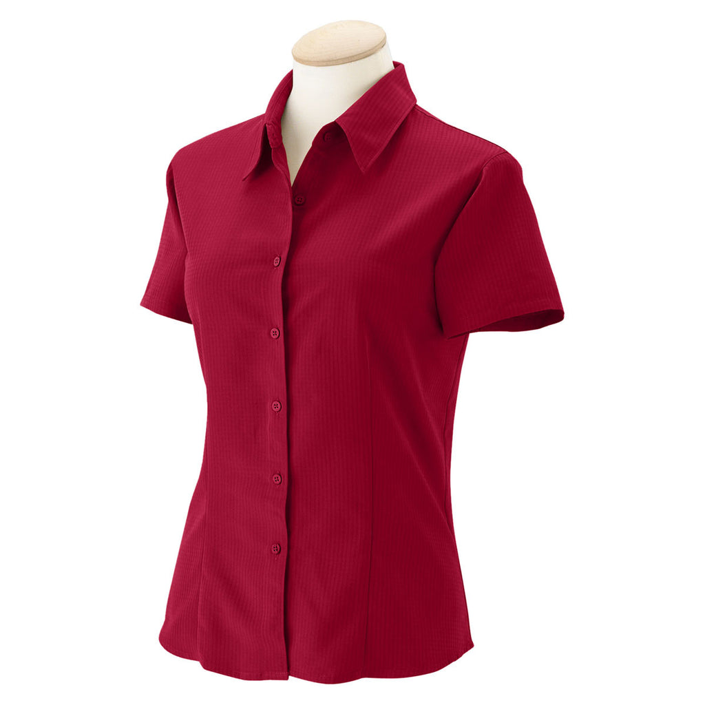 Harriton Women's Parrot Red Barbados Textured Camp Shirt are the ideal corporate gift for women on your team who appreciate high end fashion. The short sleeve camp shirt includes a special shadow weave that changes the corporate apparel game. Enjoy how your professional peers will marvel at the well-defined collar, as well as the front and back contour darts. Rugged rayon and polyester deliver a superior performance to allow the women on your team to enjoy the sand washed soft shirt for years to come. Add a custom logo to make potential customers aware of your company.Corresponding Men's Style: Harriton Men's Parrot Red Barbados Textured Camp Shirt