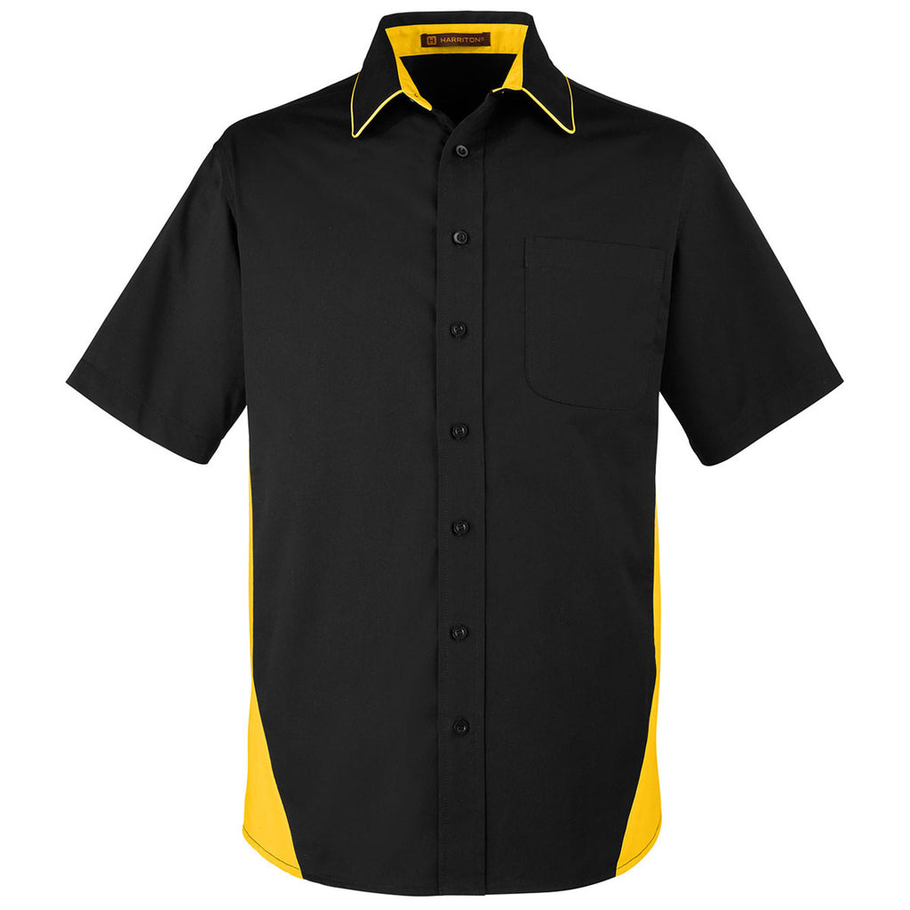 Enjoy a company logo on the Harriton Men's Black/Sunray Yellow Tall Flash Colorblock Short Sleeve Shirt to create employee apparel that can be worn as is or dressed up as corporate apparel as well. The short sleeve button up shirt is made of a cotton polyester twill blend with wrinkle resistance and stain release for day to day wear. Contrast details in all the right places create a unique look in this shirt that is available in tall sizes to find a proper fit for all. Ideal as employee gifts with a custom logo or to share with family and friends this shirt works well for many wardrobes.Highlights
