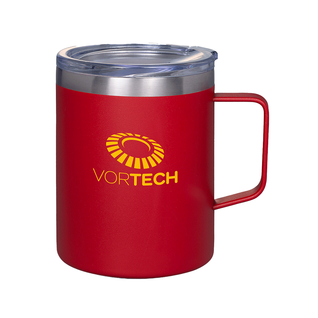 The Primeline Red 12 oz. Vacuum Insulated Coffee Mug with Handle is the perfect way for your employees or audience members to take their morning coffee - and your company's custom logo - along with them when on the go. This contemporary mug also comes in a variety of bright, eye-catching colors.The minimum order for this product is 25 pieces.