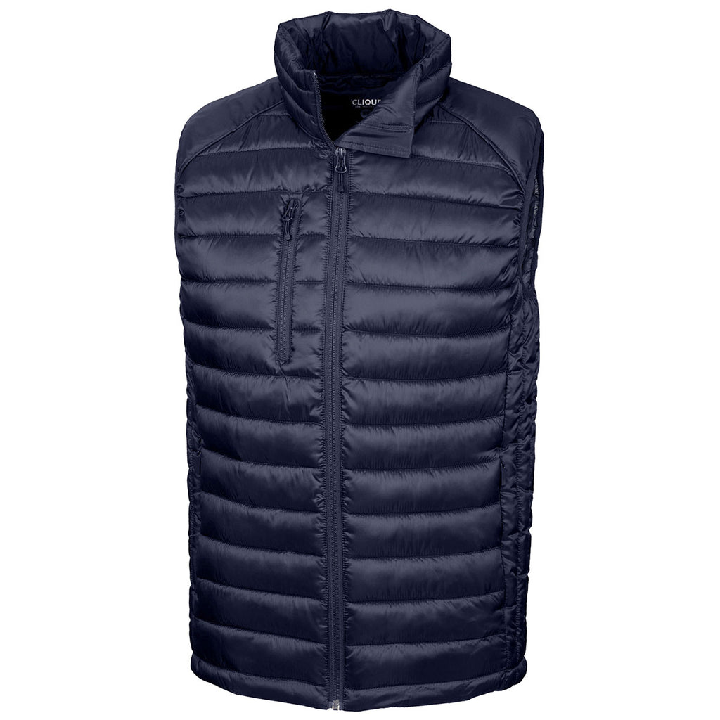 The Clique Men's Dark Navy Hudson Vest is a stylish way to stay warm. This custom logo men's vest comes in a variety of trendsetting colors and offers welcome features including 100% polyester material, water resistant quilted shell, zippered front pockets, and adjustable drawcord hem. Put your company logo on this men's vest and hand it out to your employee apparel as gift for a job well done. You can also order some to keep on hand for upcoming golf events, trade shows, and other corporate events.Corresponding Women's Style:Clique Women's Dark Navy Hudson Vest
