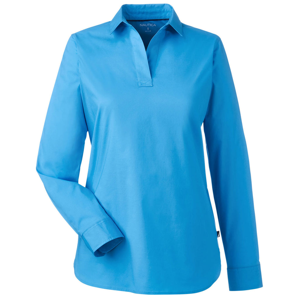 Choose a company logo for the Nautica Women's Azure Blue Staysail Shirt for a look that can serve as corporate apparel or employee apparel as needed. Dress up the long sleeve shirt with button cuffs and spread collar with split neck placket for a more upscale look or wear it alone for a more basic look that is crisp and clean all day with wrinkle resistant properties and button cuffs to keep it in place. Made of a cotton rich blend, this shirt is soft and comfortable whether stocking products or meeting with staff.