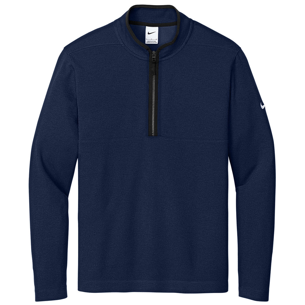 Add a custom logo to the Nike Men's College Navy Textured 1/2 Zip Cover-Up for a simple yet versatile layering option that is fun and easy to wear. The breathable, slightly brushed fabric is lightweight while keeping you warm for evening adventure. Use as company-wide apparel or add to your personal logoed apparel line.This product cannot ship outside of the United States.