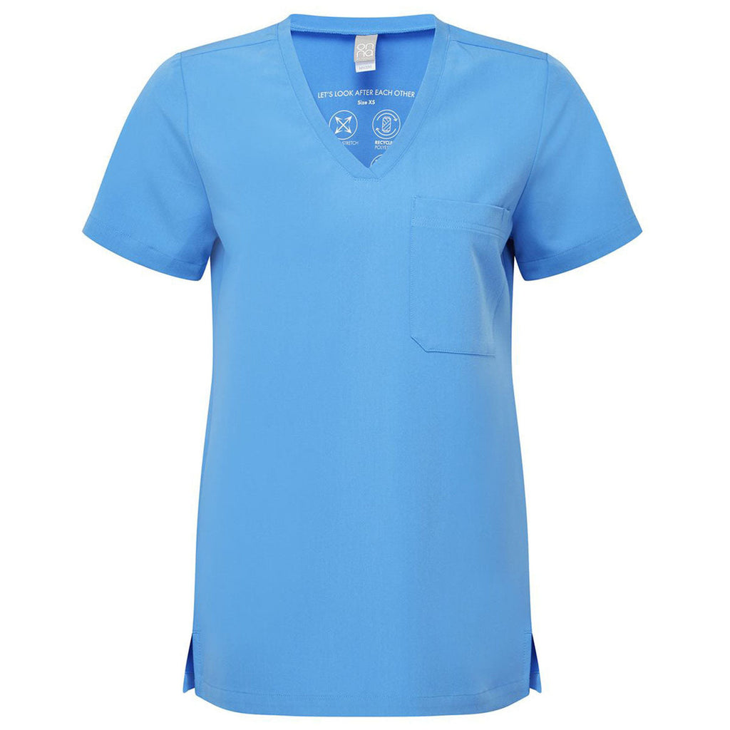 The Onna Women's Ceil Blue Limitless V-Neck Stretch Scrub Top offers a sleek, professional appearance with optional embroidery for custom branding. Its soft, stretchable fabric provides comfort and freedom of movement throughout the day. Designed for busy healthcare professionals, this top delivers a polished look and practical functionality, making it perfect for team outfitting or everyday clinical wear.Corresponding Men's Style: Onna Men's Ceil Blue Limitless V-Neck Stretch Scrub Top
