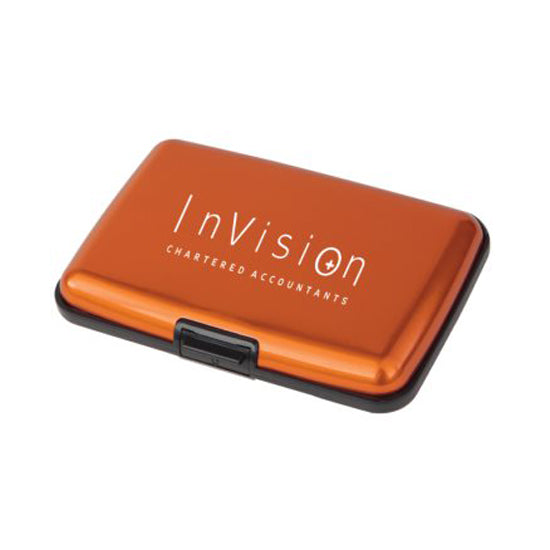 Give your employees a corporate gift they can take with them to business meetings and conferences. The K & R Orange Safeguard Card Holder offers a large area for your printed logo and is the perfect holder for business cards. It holds up to 30 cards and easily fits into pockets or work bags.