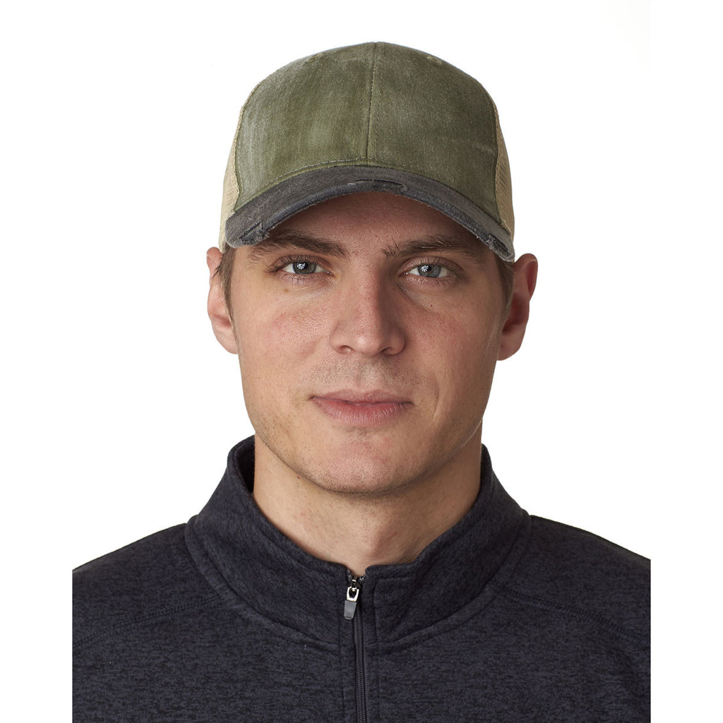 Let's be honest: it doesn't really look like a true trucker cap unless it's a little distressed. Sun-beaten. Wind-worn. This Adams Men's Cactus/Black 6-Panel Pigment-Dyed Distressed Trucker Cap has that authentic look that's perfect to represent the hard-nosed logo you've created. And with 100% cotton on the front panel and visor, you'll find plenty of comfort in representing that hard-nosed brand no matter where you go; and if you use this cap as a way to promote your event or simply to give away as prizes, people will enjoy doing exact same thing. Features a distressed/torn visor for a "rough" but stylish look.