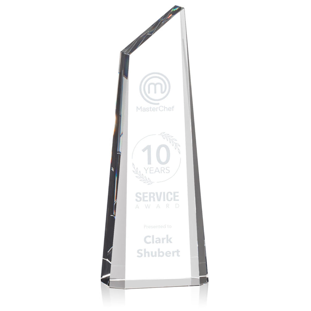 Create a custom message for the St. Regis Clear Akron Tower Award 3.75" x 10" x 2.25" without Base - Laser Engraved to give an award that is as special as the recipient. This trapezoidal tower is anchored with a thick optical crystal bottom that tapers to a peak to create an eye-catching design. Perfect for companies, services awards, or sporting championships.The minimum order for this product is 1 piece.