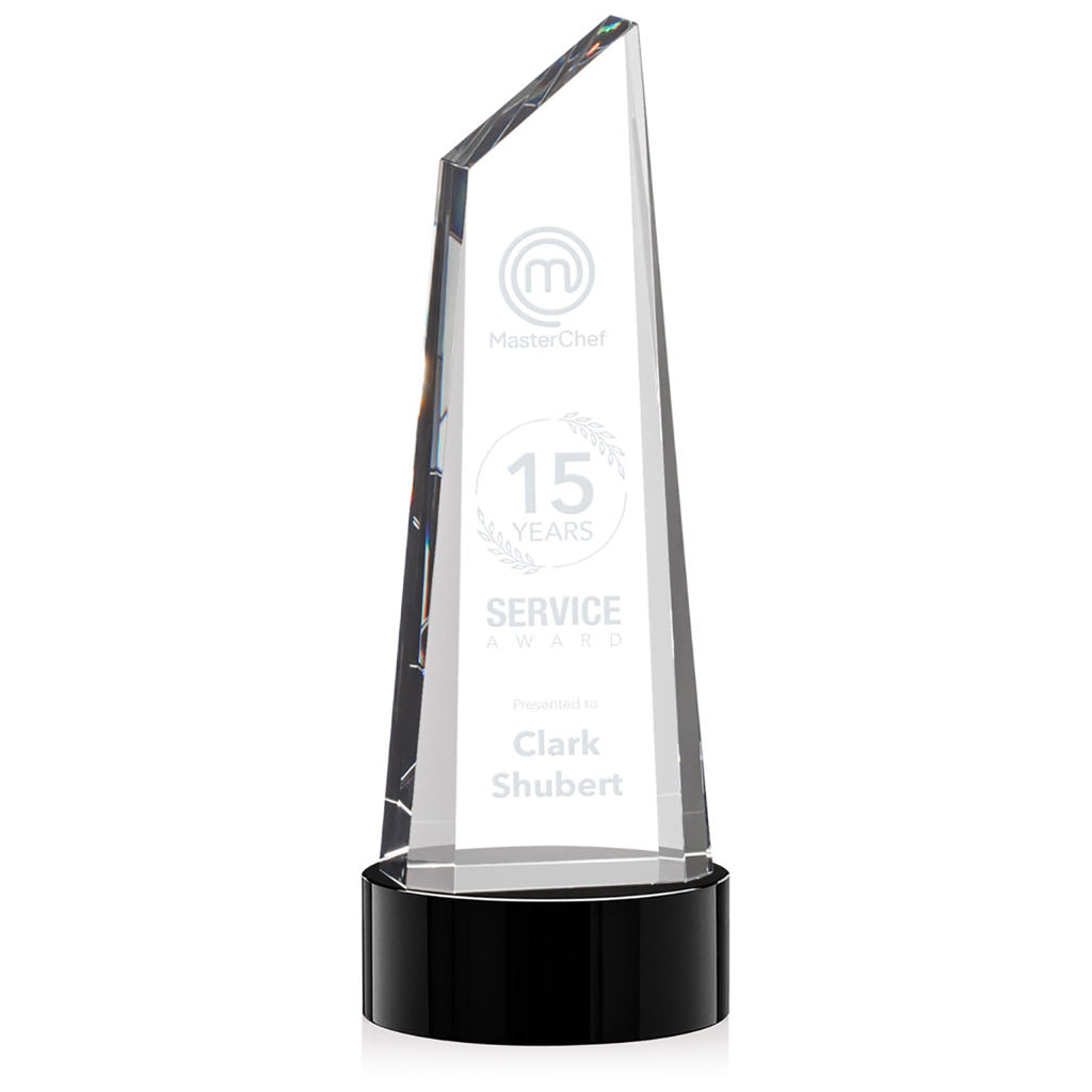 Create a custom message for the St. Regis Black Akron Tower Award 5" x 14" x 5" with Base - Laser Engraved to give an award that is as special as the recipient. This trapezoidal tower is anchored with a thick optical crystal bottom that tapers to a peak to create an eye-catching design. Perfect for companies, services awards, or sporting championships.The minimum order for this product is 1 piece.