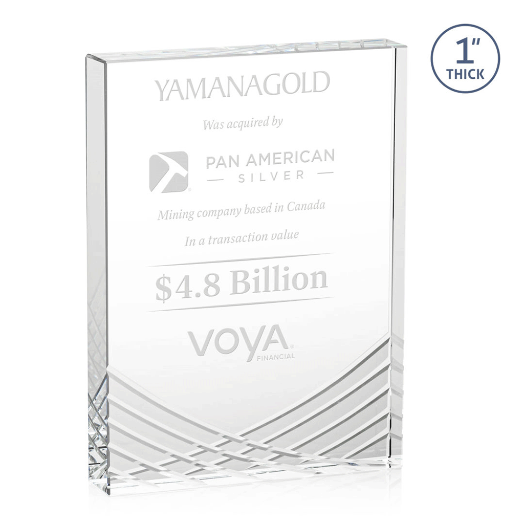 The Buchanan Optical Crystal Award is a captivating symbol of achievement and recognition. Crafted to perfection, this substantial tombstone-style piece features intricate crisscrossing grooves that exude sophistication and depth. As a striking monument to excellence, it stands as a timeless tribute to those who reach the pinnacle of success.The minimum order for this product is 1 piece.