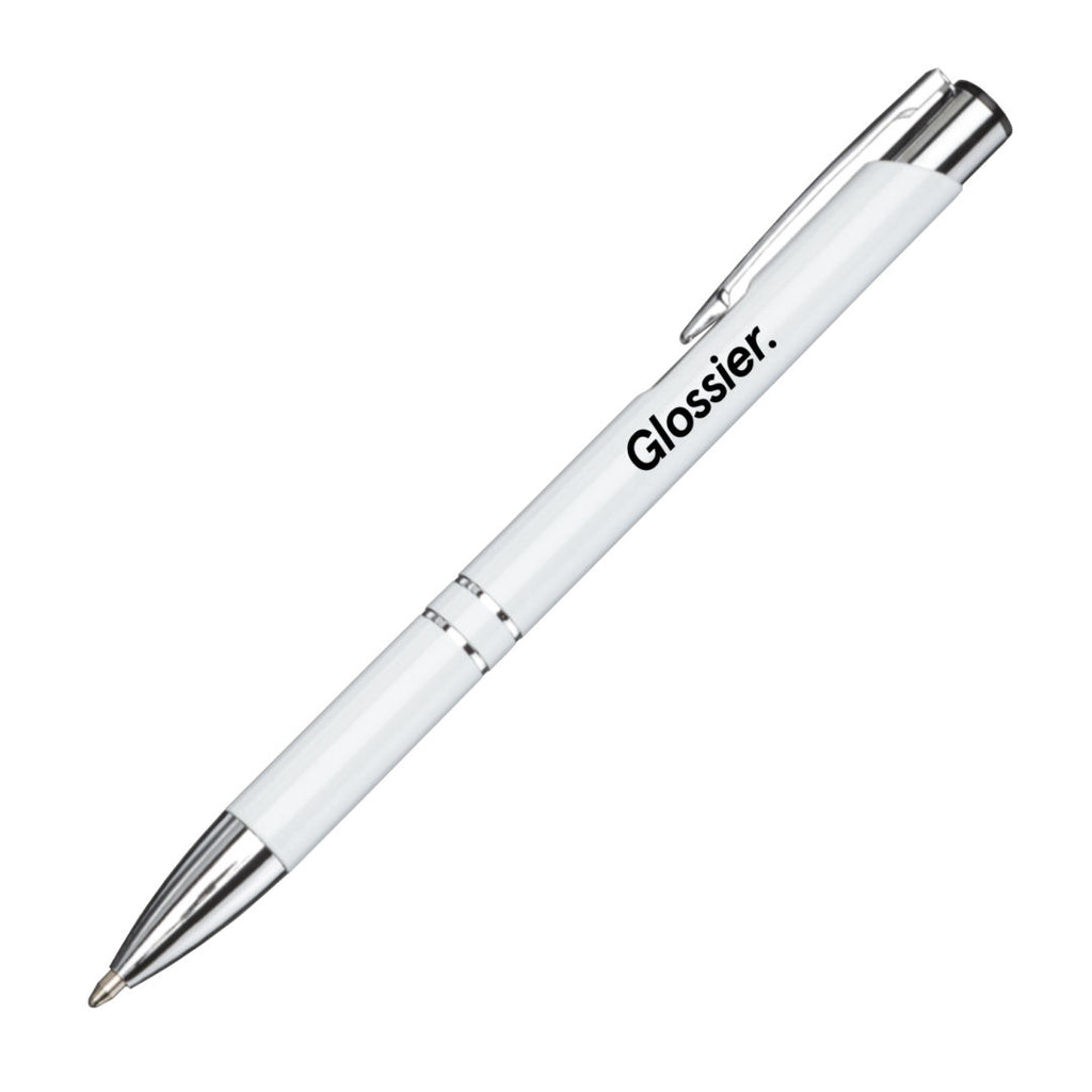 Design a corporate logo for the Clicker Pen and watch as potential customers start recognizing your name. Whether stocking your office space or handing out a simple gift to clients, this clicker pen is a must-have. The sleek, simple design is made of aluminum with chrome trim and a ballpoint pen with black ink.