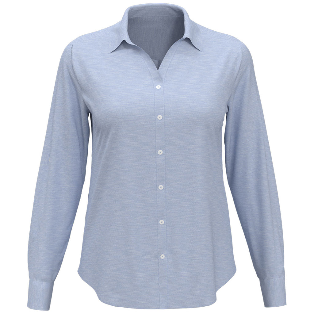 Add embroidery to the Perry Ellis Women's Little Boy Blue Heathered Woven Shirt for a fun and flirty work that can be dressed up or down as needed. The button-up V-neck has a feminine fit with sleeves that can be converted to 3/4 with ease. Ideal for work, hanging out, or a fun night with friends. Place an order today.Corresponding Men's Style: Perry Ellis Men's Little Boy Blue Heathered Woven Shirt