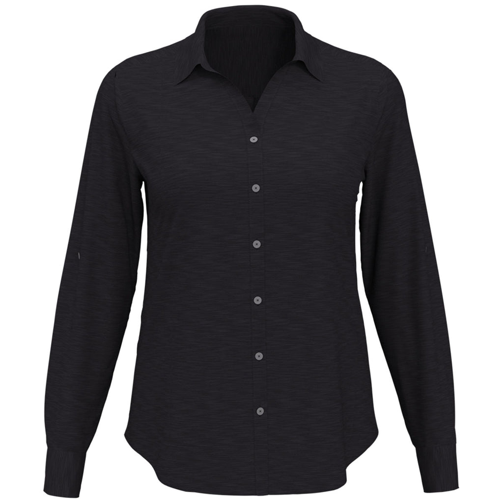 Add embroidery to the Perry Ellis Women's Caviar Black Heathered Woven Shirt for a fun and flirty work that can be dressed up or down as needed. The button-up V-neck has a feminine fit with sleeves that can be converted to 3/4 with ease. Ideal for work, hanging out, or a fun night with friends. Place an order today.