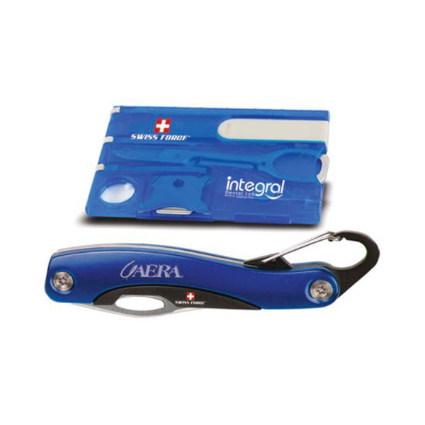 With multiple locations for your printed custom logo, the Swiss Force Blue Variety Pack is a great choice for your next promotional giveaway or corporate gifting occasion. The multi-tool and utility knife set is practical and functional and made with high-standards that ensure years of use.