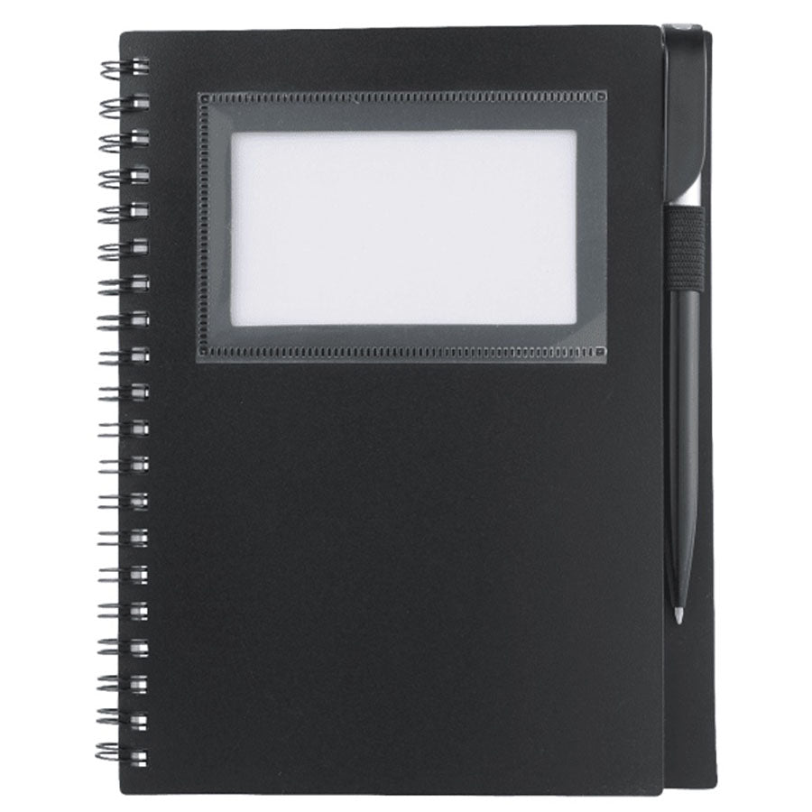 Impress your clients with the Bullet Black 5.5'' x 7'' FSC® Mix Star Spiral Notebook with Pen, a perfect blend of convenience and eco-friendly design. This versatile notebook features a polypropylene cover and includes a transparent display window that holds IDs or business cards up to 2.0" x 3.5". It comes with 70 ruled sheets of FSC® Mix paper, a built-in pen holder, and a twist-action ballpoint pen. Perfect for professionals, this notebook combines convenience with functionality. Order in bulk today to offer your clients a stylish, practical notebook that makes a lasting impression on their professional image.