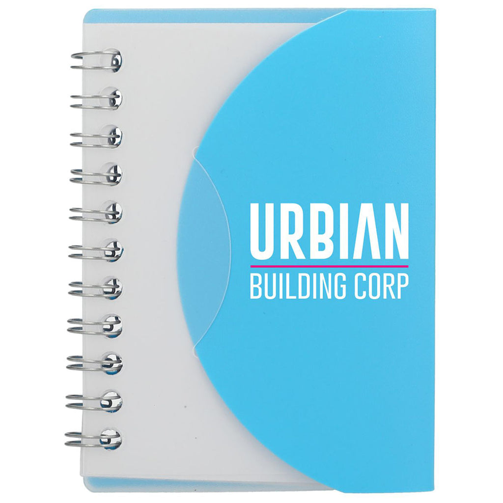 Adding your company's custom logo or design to the Bullet Translucent Blue Recycled Post Spiral Notebook will provide your team with a place to easily jot down all their great ideas. Made from environmentally conscious material, it features a sleek transparent cover and 60 blank pages inside.