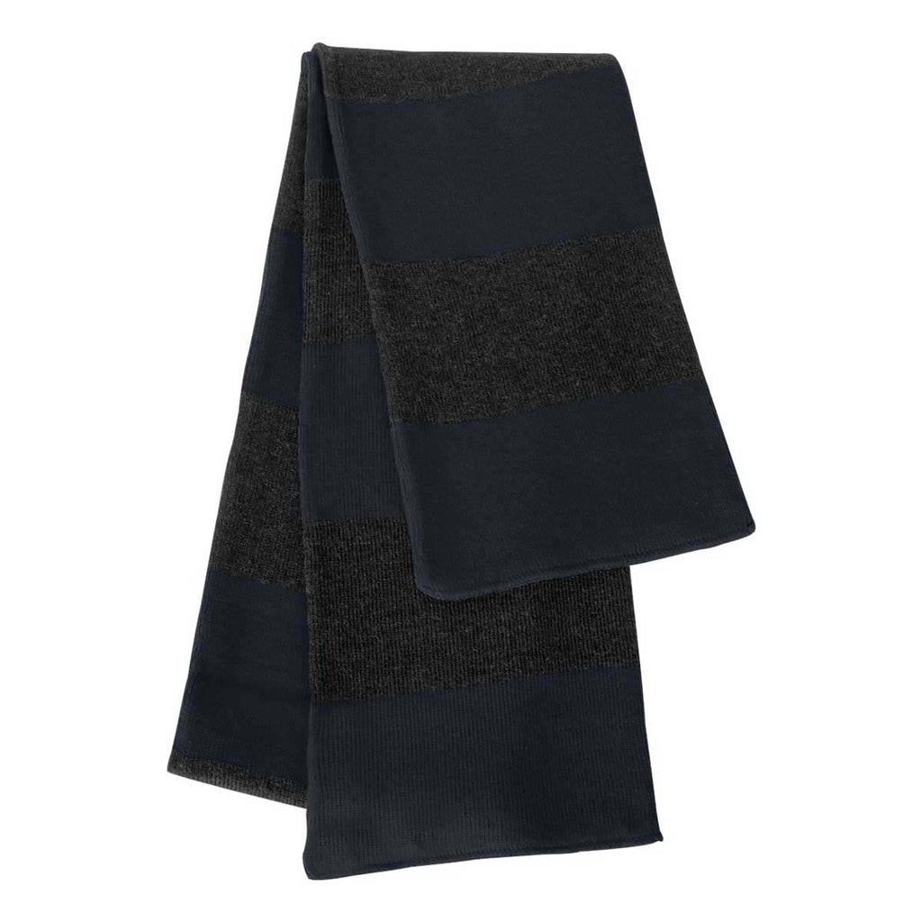 Protect yourself against the harsh weather or make a statement with a custom Sportsman Navy/Charcoal Rugby Striped Knit Scarf. Made of 100% acrylic knit with a length of 69 inches and width of 7 1/4 inches, this scarf comes in a variety of color pairings. Add a custom logo to show support for the home team or a corporate embroidery to use these scarfs as corporate gifts for the holidays or any special occasion. Perfect for sporting events when the weather is unpredictable or to use as headwear when Mother Nature sends a cold blast. Place an order right away to be prepared for whatever comes next.Highlights
